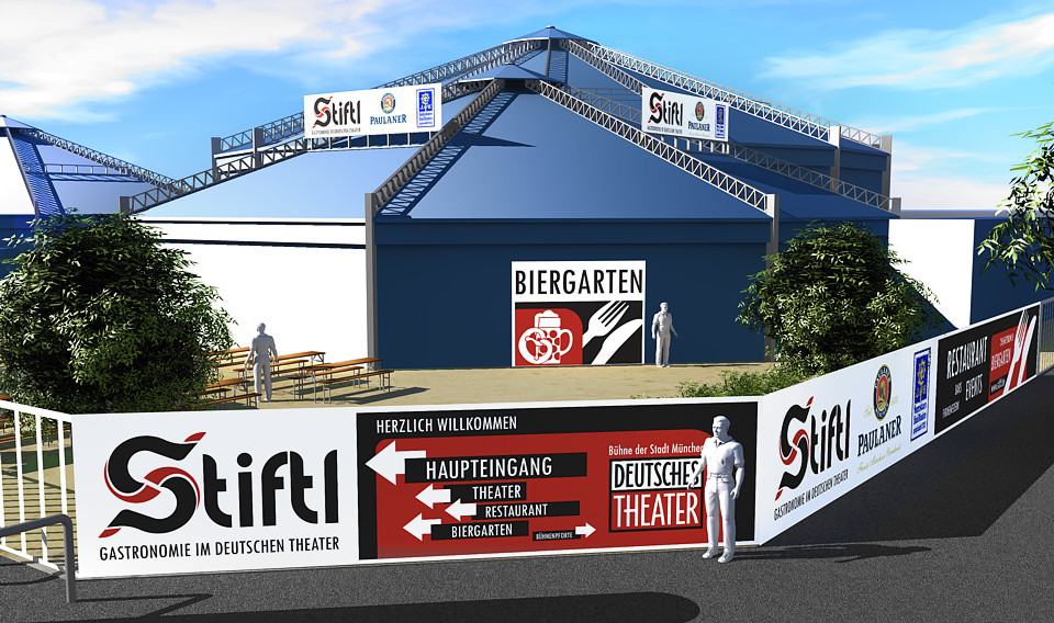 Bayerische Gemütlichkeit in kulturellem Umfeld erwartet die Gäste im traditionellen Biergarten auf dem Gelände des Deutschen Theaters München. Der besondere Reiz dieser gastronomischen Spielart spiegelt sich auch in der dezenten Gestaltung der Werbeaktionen wieder.